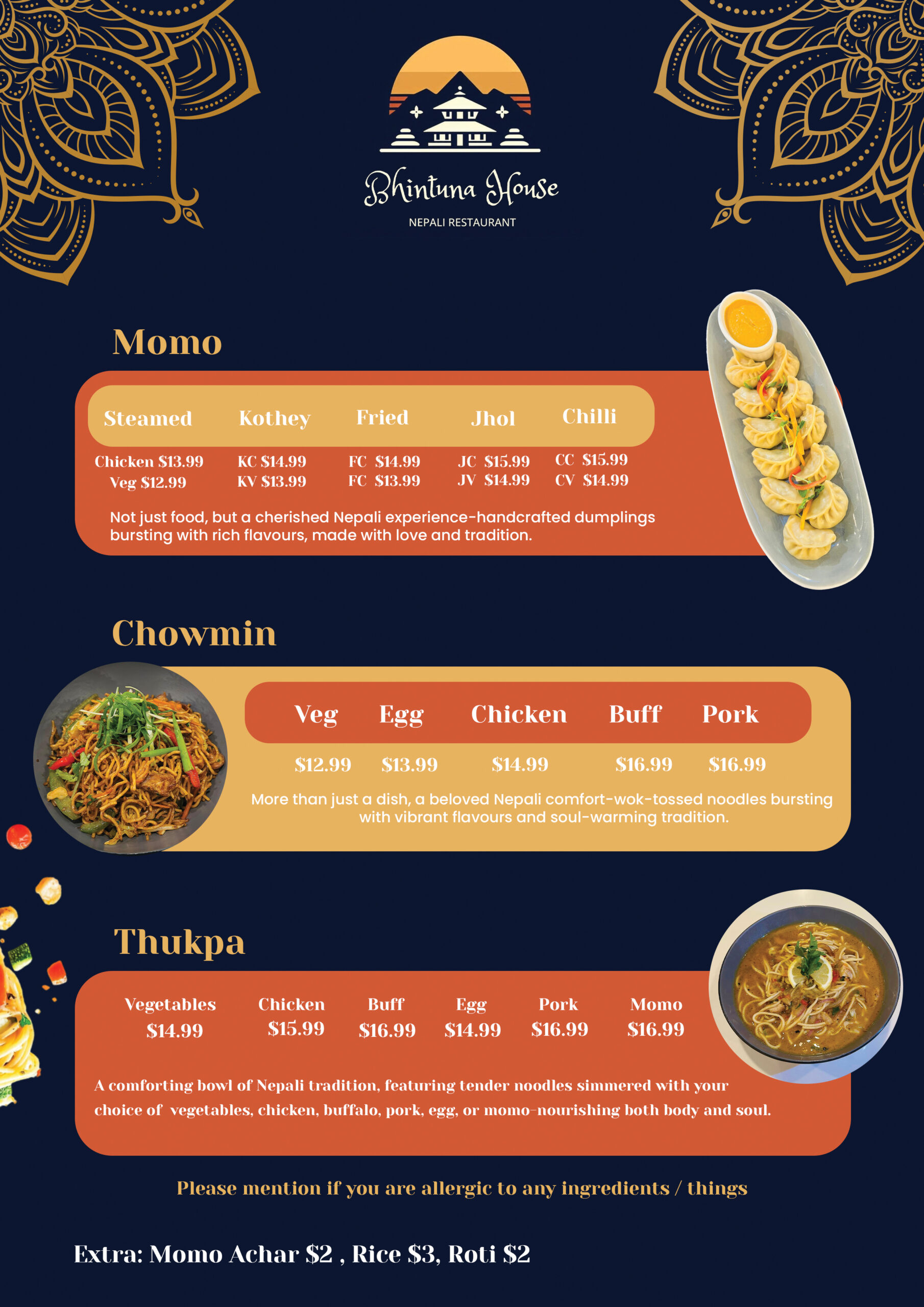 Welcome to Bhintuna House – A Taste of Nepal with a Modern Twist At Bhintuna House, we bring you more than just food — we share Bhintuna, a heartfelt Newari word meaning “best wishes.” Our name reflects our core: warm hospitality, meaningful connection, and culinary celebration. Rooted in the rich heritage of Nepal, our kitchen serves authentic Nepali dishes reimagined with a modern fusion.